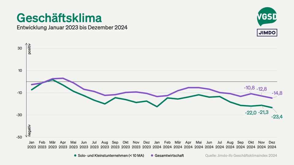 Das Geschäftsklima der Selbständigen verdunkelte sich im Dezember weiter. Der „Jimdo-ifo-Geschäftsklimaindex“ sank auf -23,4* Punkte, nach -21,3* im November. Das ist der niedrigste Wert seit Oktober 2022. Die Stimmung bezüglich der aktuellen Geschäftslage verschlechterte sich kräftig. Gleichzeitig trübten sich auch die Erwartungen weiter ein. „Die anhaltende konjunkturelle Schwäche trifft Selbständige besonders hart“, sagt ifo-Expertin Katrin Demmelhuber.